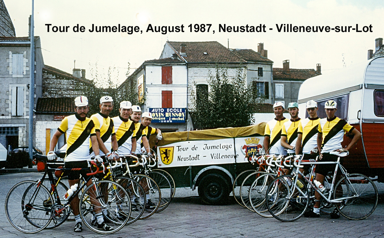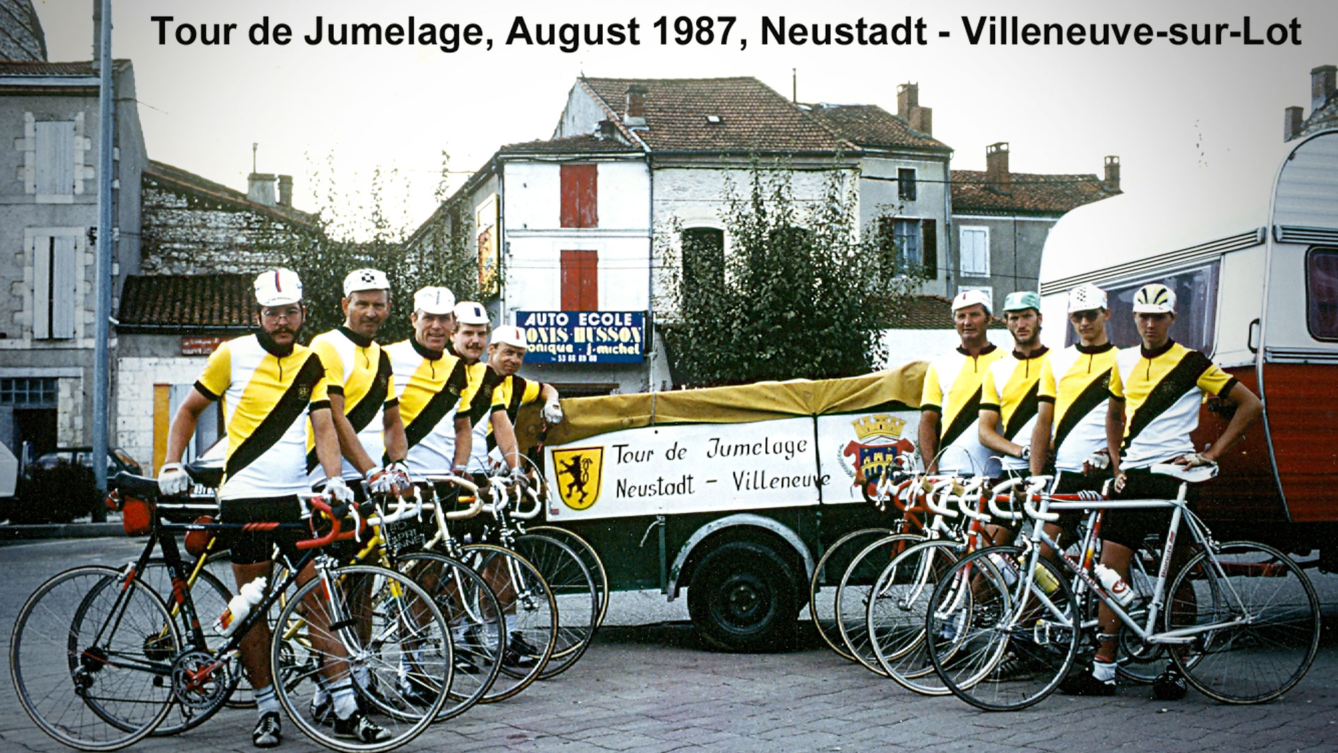 Anlässlich des zehnjährigen Bestehens der Städtepartnerschaft von Neustadt/C.mit Villeneuve-sur-Lot veranstaltet der RSC Falke im August 1987 eine Etappenfahrt in die südfranzösische Stadt. Die knapp 1900 Kilometer langen Strecke führt die neun Fahrer auch durch Neustadt/Aisch und Neustadt/Titisee im Schwarzwald. Der damalige Vorsitzende Klaus Fiedler überreicht dort jeweils Trachtenpuppen und überbringt Grüße des damaligen Neustadter Oberbürgermeister Hellmut Grempel. Als Begleitfahrzeug dient das legendäre Wohnmobil von Walter Cerwenka, ein Opel Blitz mit Wohnwagenaufbau. Das rotweiße Ungetüm mit dem Anhänger und den Schildern der „Tour de Jumelage“ erregt überall Aufsehen. Die Strecke nimmt nicht den kürzesten Weg nach Villeneuve-sur-Lot, sondern bringt die Teilnehmer durch das Rhonetal bis ans Mittelmeer.